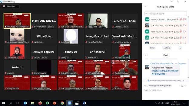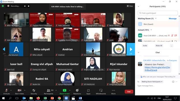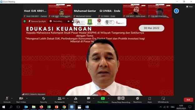 BISNISBANTEN.COM — OJK Regional 1 DKI Jakarta dan Banten kembali menggelar edukasi keuangan secara virtual, Senin (30/5). Kali ini,  Kegiatan Edukasi Keuangan diberikan Kepada Mahasiswa Kelompok Studi Pasar Modal Wilayah Tangerang dan Sekitarnya dengan tema Mengenal Lebih Dekat OJK, Perlindungan Konsumen Era Digital, Teori dan Praktik Investasi Bagi Generasi Milenial di Pasar Modal.