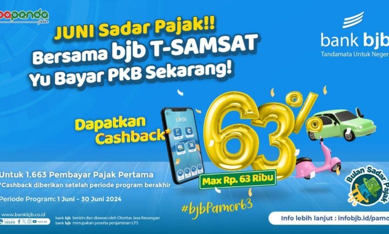 BISNISBANTEN.COM – bank bjb terus memberikan berbagai kemudahan kepada masyarakat dan nasabah, kali ini bank bjb menghadirkan program promosi bjb Pamor 63. Program ini memberikan cashback sebesar 63% atau maksimal Rp63.000 kepada nasabah yang melakukan pembayaran pajak kendaraan bermotor selama bulan Juni 2024, dengan syarat terdaftar dan memiliki layanan bjb T-Samsat serta layanan bjb DIGI Mobile yang masih aktif.