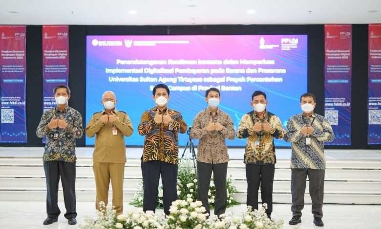 Untuk semakin mendorong implementasi QRIS hingga di seluruh lapisan masyarakat, KPw BI Provinsi Banten mendukung digitalisasi di perguruan tinggi. Dalam rangkaian kegiatan menyaksikan bersama Opening Ceremony FEKDI 2022, dilaksanakan penandatanganan Komitmen Bersama untuk memperluas implementasi digitalisasi pembayaran pada sarana dan prasarana Universitas Sultan Ageng Tirtayasa (Untirta) sebagai proyek percontohan digitalisasi. KPw BI Provinsi Banten menggandeng Bank Negara Indonesia sebagai mitra dalam merealisasikan smart campus di Untirta. Ke depannya, KPw BI Provinsi Banten akan terus mendorong perluasan digitalisasi hingga ke perguruan tinggi dan fasilitas umum lainnya yang dapat meningkatkan elektronifikasi di masyarakat.