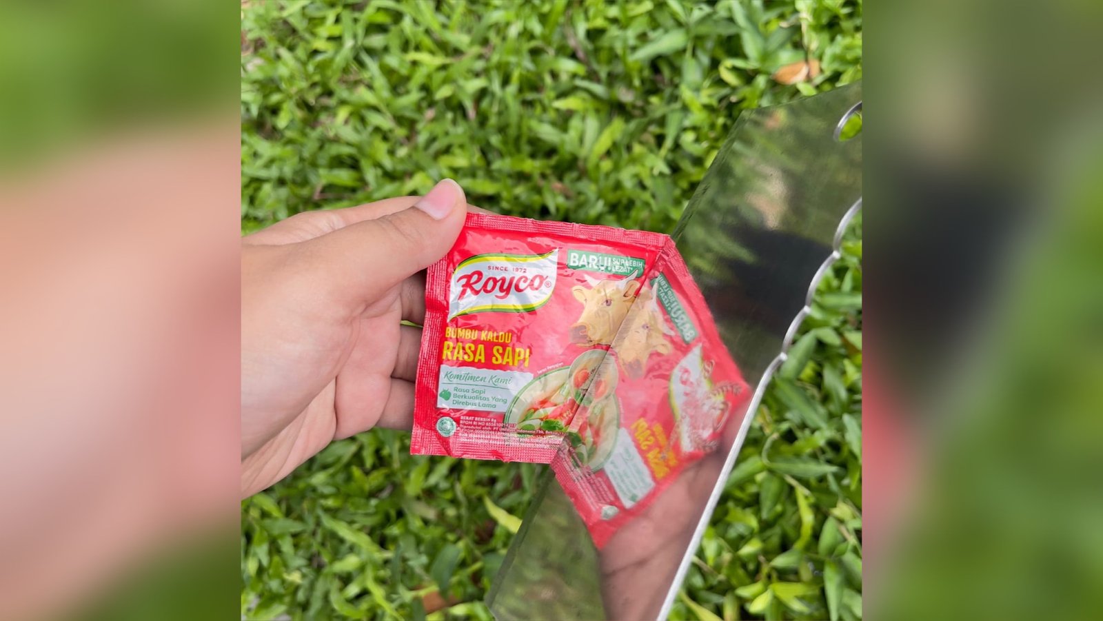 Pada postingan tersebut, ia memposting foto kemasan sachet Royco Sapi yang sedang dipotong menggunakan pisau potong.