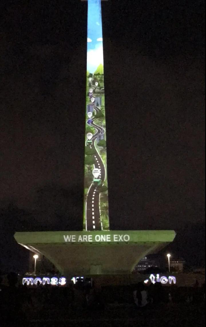 Dalam unggahan foto-foto yang tersebar di Twitter, Facebook hingga TikTok, tulisan itu muncul di dalam video mapping Monas. Dari ‘ILY Jaehyun’, ‘Lee Jeno’ hingga ‘We Are One Exo’. Munculnya nama idola K-Pop itu tak hanya satu atau dua kali.