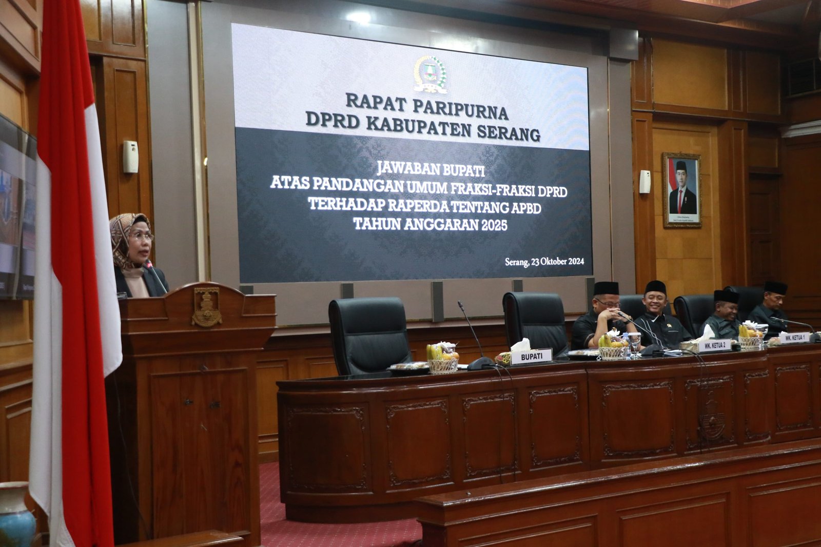 Rapat Paripurna DPRD Kabupaten Serang Jawaban Bupati atas Pandangan Umum Fraksi-Fraksi DPRD terhadap Raperda tentang APBD Tahun Anggaran 2025 dipimpin Wakil Ketua DPRD Kabupaten Serang Fraksi PKS Agus Wahyudiono. Turut hadir para pejabat eselon II dan III di lingkungan Pemkab Serang.