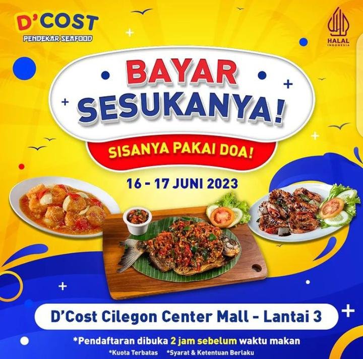 Kabar gembiranya, D’cost Cilegon Center Mall ini ada promo “Bayar sesukanya, sisanya pakai doa” jadi pengunjung boleh bayar sesukanya dan sisanya pakai doa setelah menikmati menu dari D’cost ini.