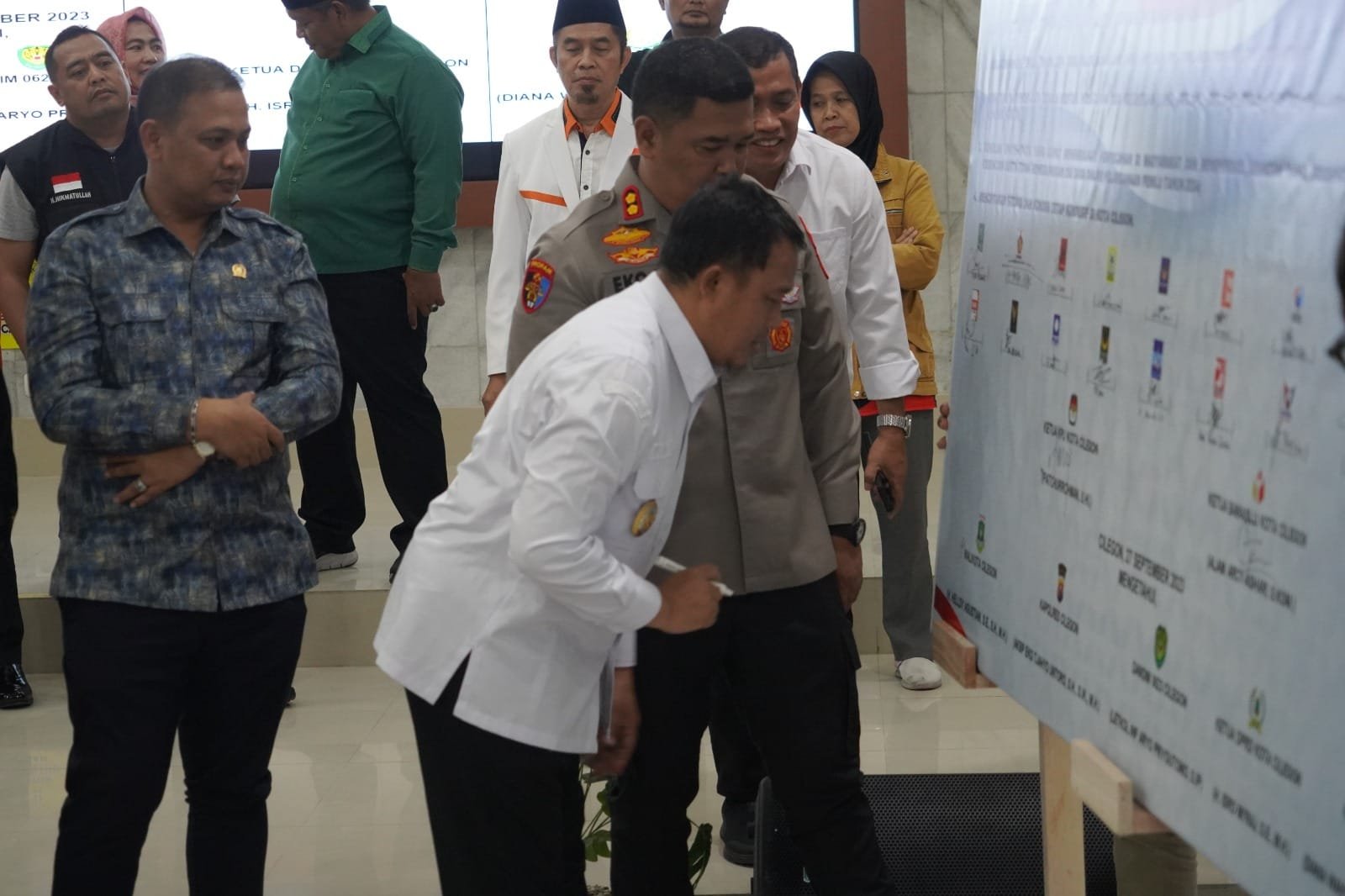 BISNISBANTEN.COM – Wakil Walikota Cilegon Sanuji Pentamarta mengajak seluruh stakehoders dan masyarakat untuk bersama-sama terlibat dalam menciptakan Pemilihan Umum (Pemilu) yang damai pada tahun 2024 nanti. Hal itu disampaikan Sanuji saat menghadiri Deklarasi Pemilu Damai Tahun 2024 yang digelar Polres Cilegon bersama Forkopimda, Partai Politik dan Penyelenggara Pemilu di Gedung Serbaguna Polres Cilegon, Rabu (279/2023).