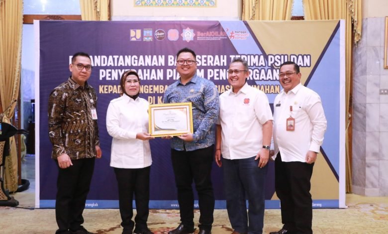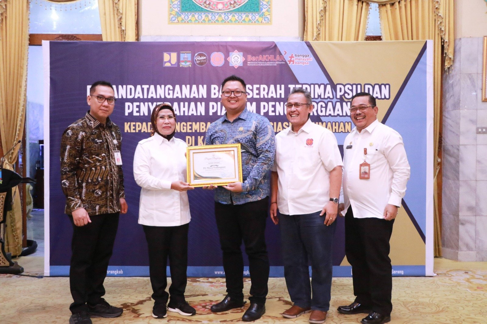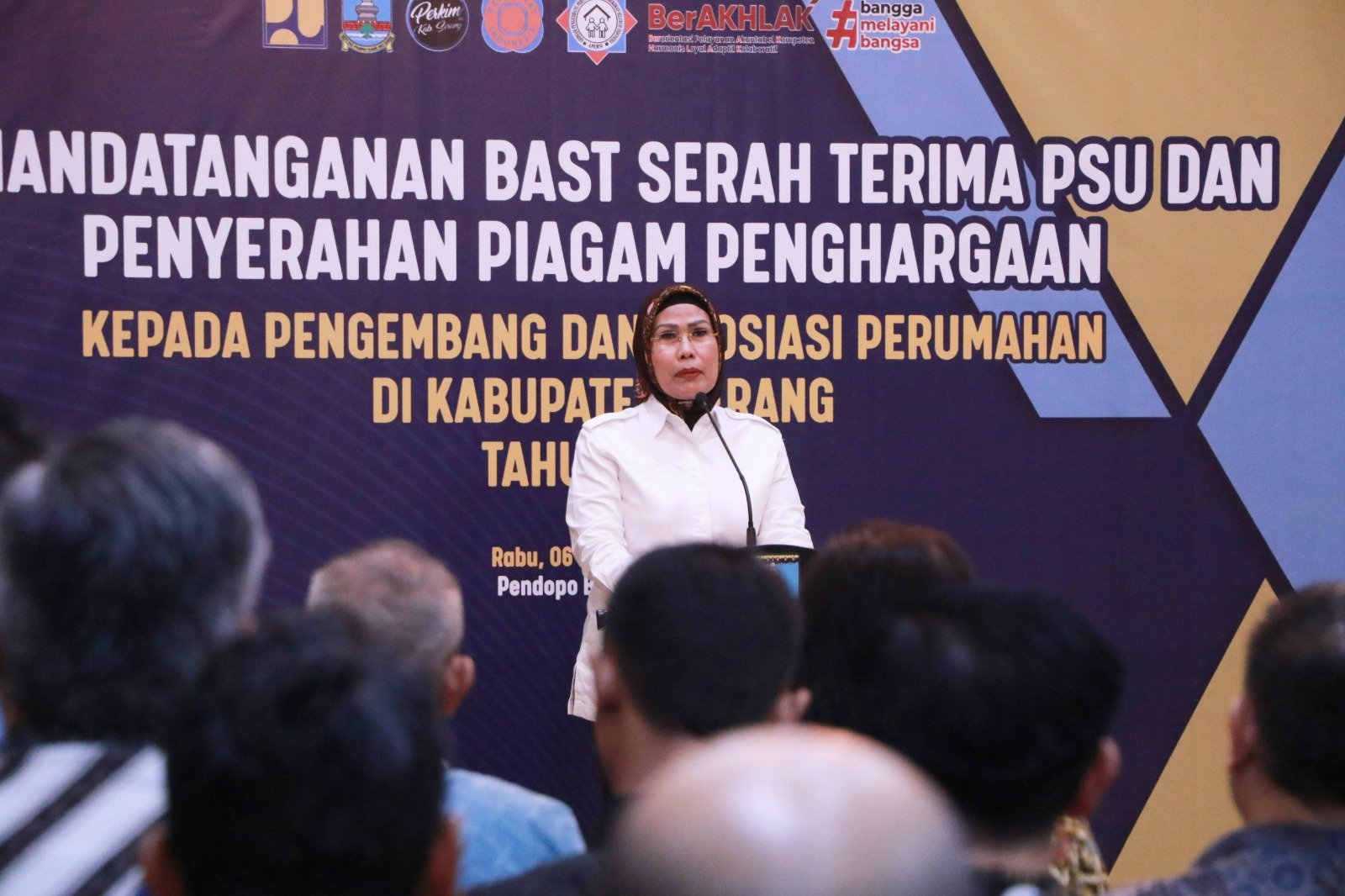 Demikian diungkapkan Bupati Serang Ratu Tatu Chasanah kepada awak media usai melakukan penandatanganan BAST serah terima PSU Perumahan Tahun 2024 bersama para pengembang di Pendopo Bupati Serang, Rabu (6/11/2024). Selain itu, Bupati Serang juga memberikan penghargaan kepada pengembang, DPD Real Estate Indonesia (REI) Banten, dan DPD Asosiasi Pengembang Perumahan dan Permukiman Seluruh Indonesia (Apersi) Banten.