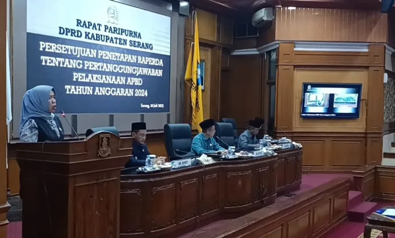 BISNISBANTEN.COM- Dewan Perwakilan Daerah Rakyat (DPRD) Kabupaten Serang menilai penyerapan anggaran dan perlindungan aset oleh Pemerintah Kabupaten (Pemkab) Serang lemah. Itu disampaikan Juru Bicara (Jubir) DPRD Kabupaten Serang Fraksi PDI Perjuangan Fatmawati saat membacakan pandangannya pada Rapat Paripurna Rancangan Peraturan Daerah (Raperda) menjadi Peraturan Daerah (Perda) tentang Pertanggungjawaban Pelaksanaan Anggaran Pendapatan Belanja Dawerah (APBD) Tahun 2024 di Ruang Rapat Paripurna DPRD Kabupaten Serang, Kamis (10/7/2025).