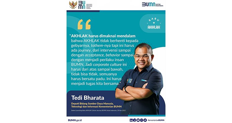 Deputy Bidang Sumber Daya Manusia, Teknologi dan informasi Kementerian BUMN, Tedi Bharata mengatakan, “AKHLAK harus dimaknai mendalam bahwa AKHLAK tidak berhenti kepada gebyarnya, tothem-nya tapi ini harus ada journey, dari intervensi sampai dengan acceptance, behavior sampai dengan menjadi perilaku insan BUMN.”