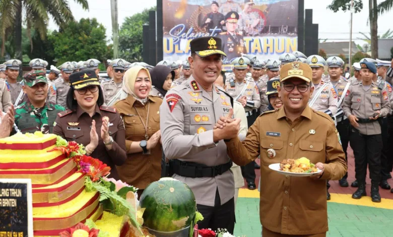 Usai Apel Gelar Pasukan Operasi Patuh Maung Tahun 2025 dilakukan potong tumpeng ulang tahun Kapolda Banten Irjen Pol Suyudi Ario Seto yang ke 52. Potongan tumpeng pertama diserahkan kepada Gubernur Banten. Potongan kedua diserahkan kepada Danrem 064 Maulana Yusuf Brigjen TNI Andrian Susanto. (susi)