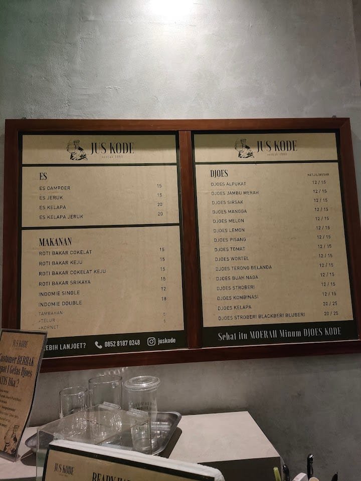 Di sini, Anda bisa menikmati berbagai jenis menu jus yang Anda sukai sepuasnya. Pasalnya harga yang ditawarkan cukup terjangkau namun menyuguhkan porsi yang cukup besar. Per gelasnya, Jus Kode dibanderol dengan harga Rp 12 ribu untuk ukuran kecil dan Rp 15 ribu untuk ukuran besar.