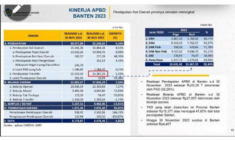 Belanja TKD terealisasi sebesar Rp15,37 triliun, atau 92,40% dari pagu, dengan pertumbuhan 1,41%. Realisasi TKD disalurkan untuk mendukung belanja Pemda yang mencakup berbagai sektor seperti pendidikan, kesehatan, infrastruktur, dan bantuan sosial. Dana alokasi umum (DAU), dana bagi hasil (DBH), dan dana desa menjadi komponen utama yang tumbuh positif.