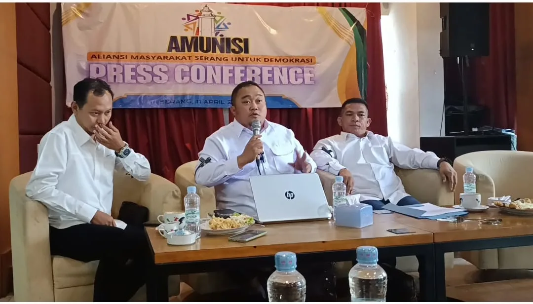 Pernyataan tersebut disampaikan Koordinator AMUNISI, Sendi Ardianto didampingi Sekretaris AMUNISI Reno dan Anggota AMUNISI Pandu Pratama dalam Konferensi Pers AMUNISI bertajuk ‘Netralitas Kades, Netralitas Polri Untuk Demokrasi’ di Cafe Kopi Jalu, Kota Serang, Jumat (11/4/2025) siang.