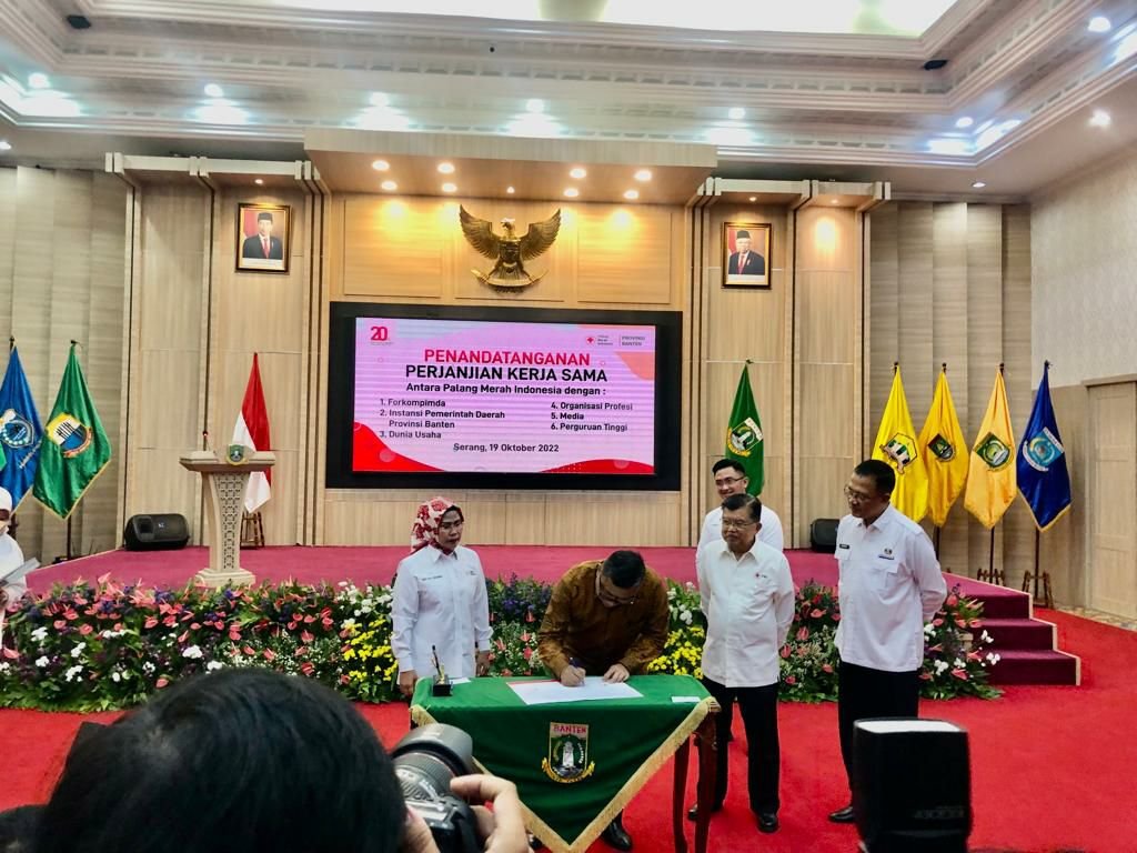 BISNISBANTEN.COM — Jamkrida Banten menandatangani kerja sama dengan Palang Merah Indonesia (PMI) Provinsi Banten dalam bidang kemanusiaan. Penandatanganan ini dilakukan oleh Direktur Utama Jamkrida Banten Hendra Indra Rachman dengan Ketua PMI Banten Ratu Tatu Chasanah yang disaksikan Ketua Umum PMI Jusuf Kalla di Pendopo Gubernur Banten, KP3B, Curug, Kota Serang, Rabu (19/10).