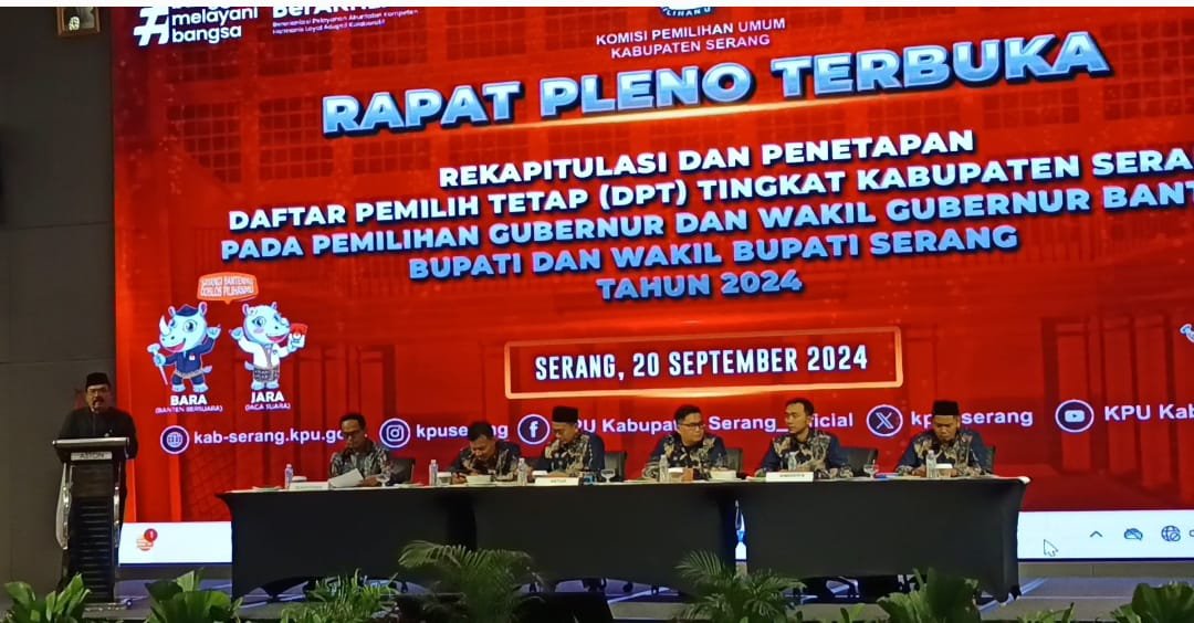 BISNISBANTEN.COM- Komisi Pemilihan Umum (KPU) Kabupaten Serang menggelar Rapat Pleno Terbuka Rekapitulasi dan Penetapan Daftar Pemilih Tetap (DPT) tingkat Kabupaten Serang pada Pemilihan Gubernur dan Wakil Guvernur Bupati dan Wakil Bupati Serang Tahun 2024 di Aston Serang Hotel & Convention, Jumat (20/9/2024). Hasilnya, terjadi pengurangan sekira 1.223 pemilih berdasarkan hasil rekapitulasi Data Pemilih Sementara Hasil Perbaikan (DPSHP) di tingkat kecamatan, dari sebelumnya di DPS sebanyak 1.227.094 pemilih.