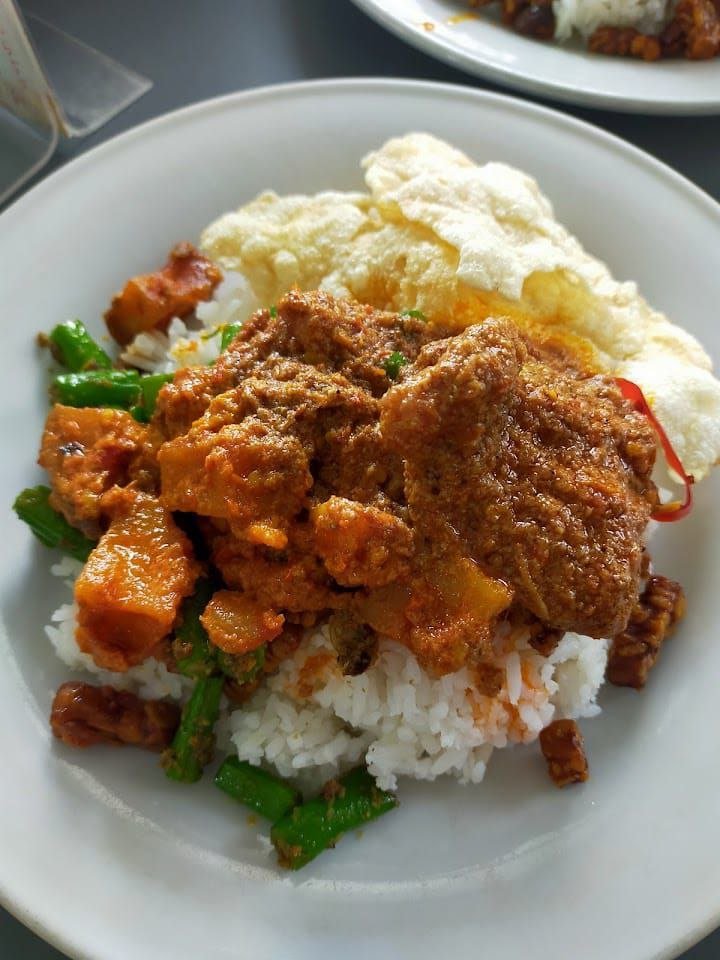 Disini, menu yang banyak diincar favorit para pelanggan ada nasi rames daging yang dibanderol seharga Rp 35 ribu per porsinya. Satu porsinya terdapat daging rendang yang teksturnya empuk, sambal goreng kentang, oseng buncis, orek tempe dan setengah potong telur rebus plus emping.