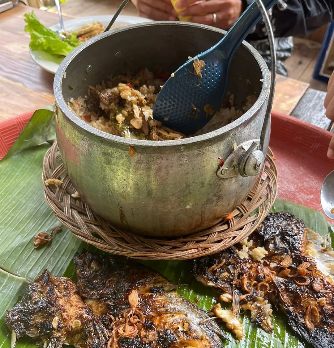Penyajian nasi gonjleng yakni di periuk. Cocok disantap dengan ikan bakar dengan sambal kecap yang dipenuhi irisan cabai dan bawang. Hmm yummy. (Hilal)
