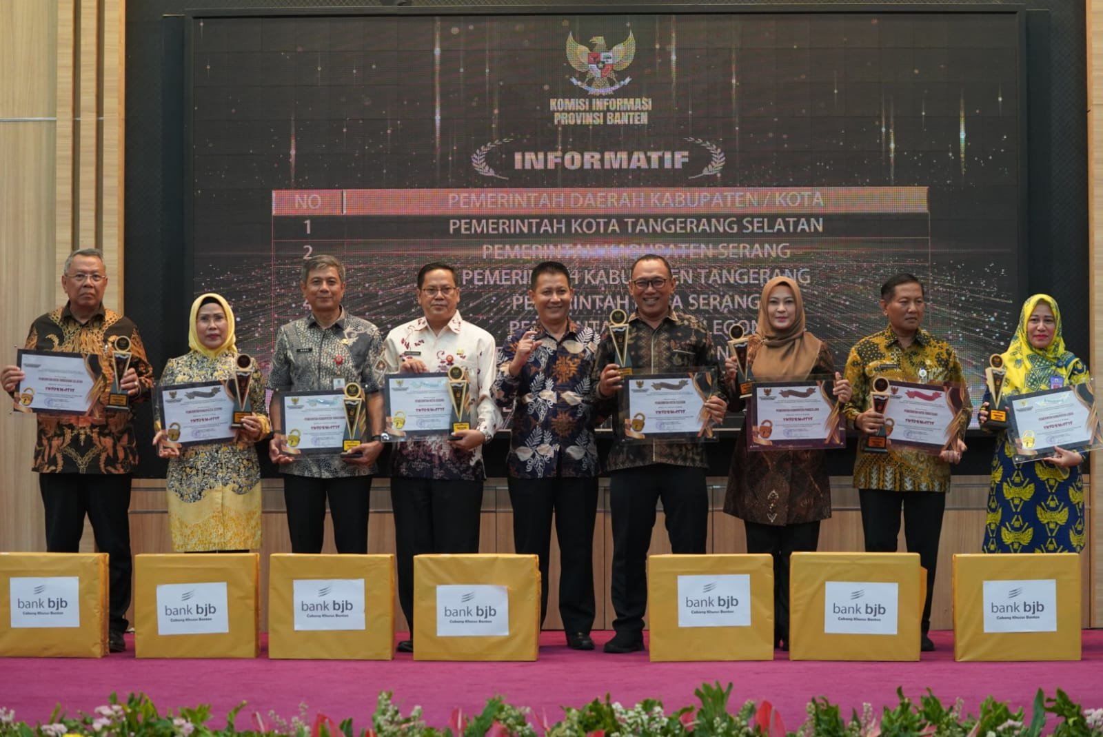 Diketahui, delapan kabupaten kota di Banten mendapat anugerah informatif dengan nilai yang beragam. Antara lain Tangerang Selatan dengan nilai 98,53 poin, Kabupaten Serang 98,37 poin, Kabupaten Tangerang 97,87 poin, Kota Serang 97,80 poin, Kota Cilegon 97,20 poin, Pandeglang 93,14 poin, Kota Tangerang 92,25 poin dan Lebak 91,9 poin.