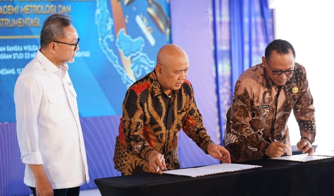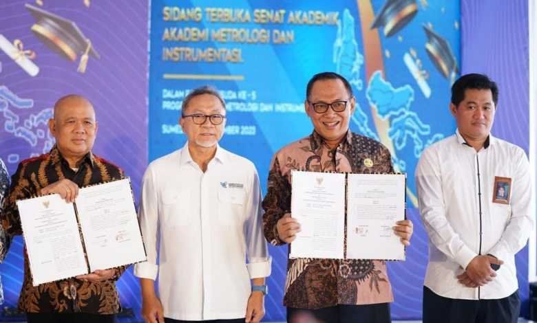 BISNISBANTEN.COM — Menyusul pendatanganan Memorandum of Understanding (MoU) antara Pemkot Cilegon dengan Akademi Metrologi dan Instrumentasi (Akmet), peluang lulusan SMA/SMK dari Kota Cilegon untuk berkuliah di Akmet kini terbuka lebar. Penandatanganan MoU berlangsung di acara Sidang Terbuka Senat  Akmet, dalam rangka Wisuda ke-5 Program Studi D3 Metrologi dan Instrumentasi, Rabu 13 Desember 2023, di kampus Akmet, Sumedang, Jawa Barat. MoU ditandatangani Wali Kota Cilegon Helldy Agustian dan Plt. Sekjen Kementerian Perdagangan Suhanto, disaksikan Menteri Perdagangan Zulkifl Hasan.