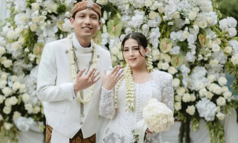 Nessie Judge tampak menggunakan kebaya dengan nuansa berwarna putih selaras dengan baju yang dipakai suaminya. Ia dan sang suami tampak serasi mengenakan pasangan baju adat pernikahan khas Jawa.