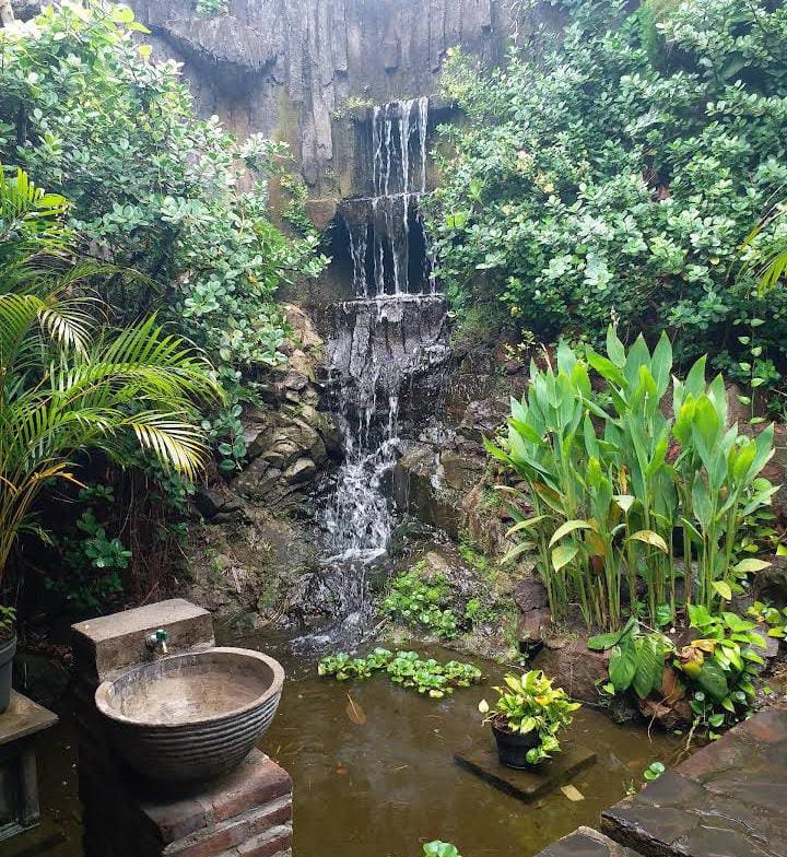 Ada hiasan berupa kolam ikan mini dan air terjun mini, sehingga seperti makan di tengah hutan.