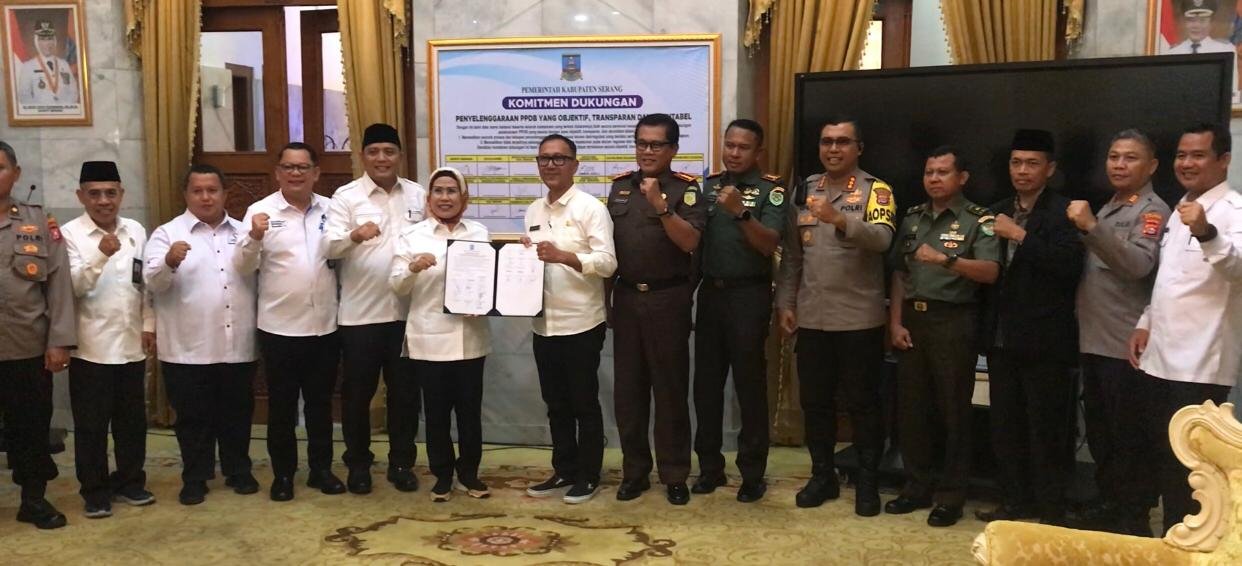 BISNISBANTEN.COM — Jajaran Pemerintah Kabupaten (Pemkab) Serang bersama unsur Forum Koordinasi Pimpinan Daerah (Forkopimda) dan stakeholder terkait membangun komitmen mendukung terlaksananya Penerimaan Peserta Didik Baru (PPDB) di Kabupaten Serang sebagai antisipasi terjadinya kecurangan, ditandai dengan penandatanganan dokumen komitmen di Pendopo Bupati Serang, Rabu (12/6/2024).