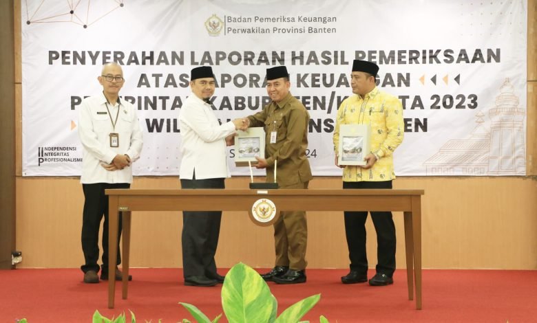 LHP atas LKPD Pemkab Serang diserahkan lamgsung oleh Kepala Perwakilan BPK RI Provinsi Banten Dede Sukarjo kepada Sekretaris Daerah (Sekda) Pemkab Serang Nanang Supriatna didampingi Ketua DPRD Kabupaten Serang Bahrul Ulum di Aula BPK RI Perwakilan Banten, Palima, Kota Serang, Senin (6/5/2024).