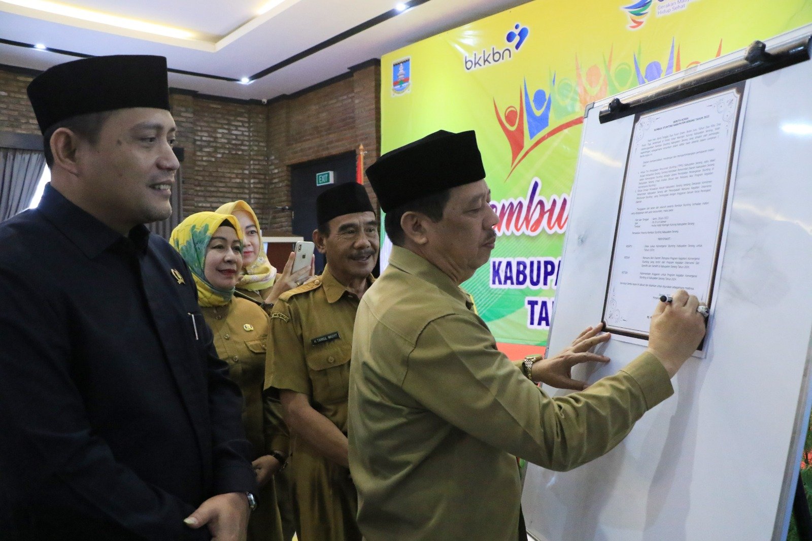 Target itu disampaikan Sekretaris Daerah (Sekda) Kabupaten Serang Tubagus Entus Mahmud Sahiri pada acara Rembuk Stunting Kabupaten Serang yang digelar Dinas Keluarga Berencana Pemberdayaan Perempuan dan Perlindungan Anak (DKBP3A) di Horison Forbis Hotel Kecamatan Waringinkurung, Kabupaten Serang, Senin (26/6/2023). Turut hadir perwakilan dari Kementerian Dalam Negeri (Kemendagri), Ketua DPRD Kabupaten Serang Bahrul Ulum, para Kepala OPD, camat, kades dan stakeholder terkait lainnya. Pada Rembuk Stunting juga dilakukan deklarasi percepatan penurunan angka stunting.