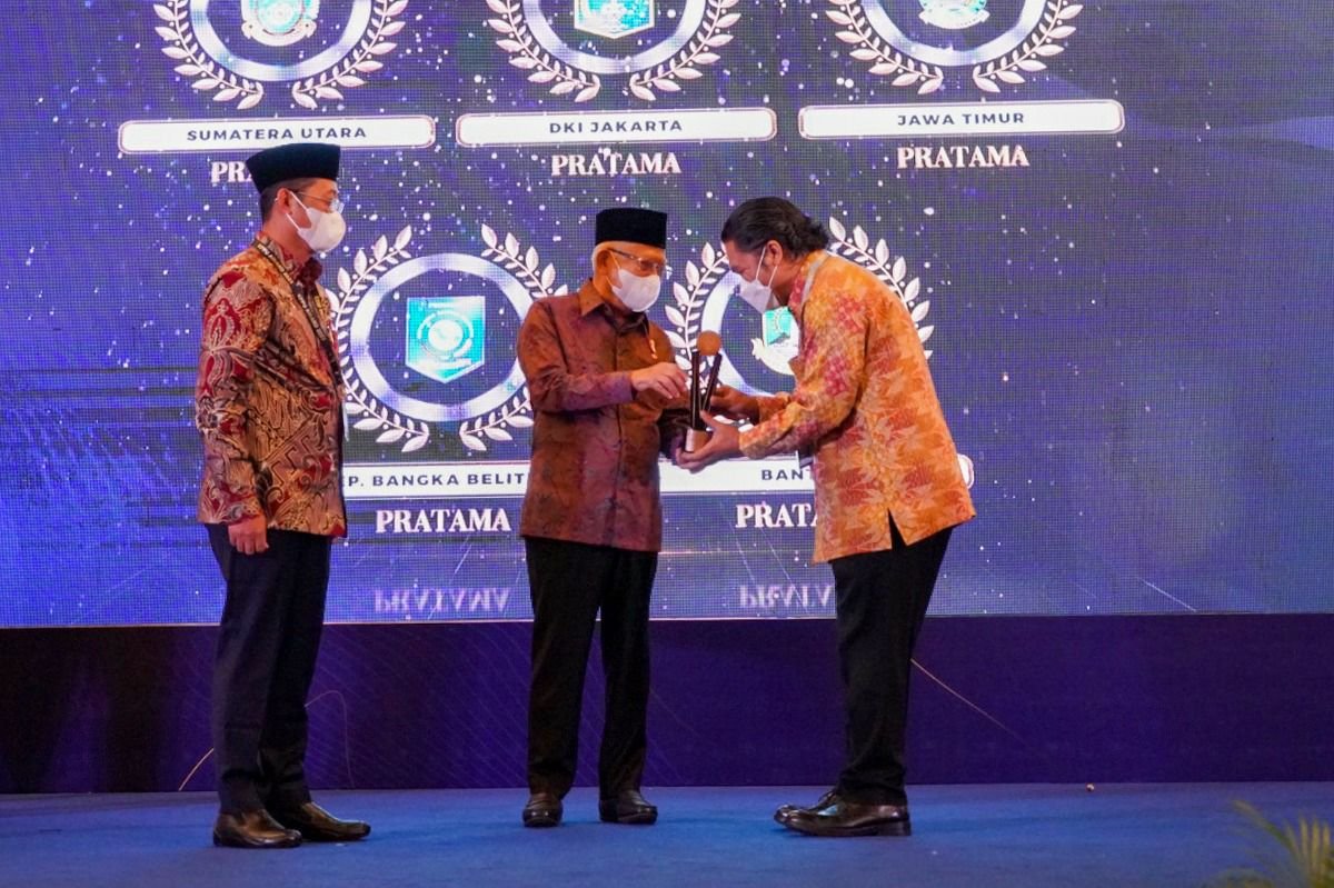 Penghargaan diberikan oleh Wakil Presiden RI KH Ma’ruf Amin kepada Penjabat (Pj) Gubernur Banten Al Muktabar di Ballroom Hotel Indonesia Kempinski, Jakarta, Kamis (16/2/2023). Provinsi Banten merupakan satu dari 11 Provinsi yang mendapatkan penghargaan dari KPPU.
