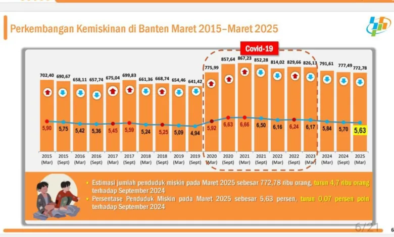 Paska pandemi Covid-19, tren penurunan angka kemiskinan di Provinsi Banten terus terjadi sejak periode Maret 2023. Dari 6,24 persen pada periode September 2022 turun menjadi 5,63 pada periode Maret 2025.