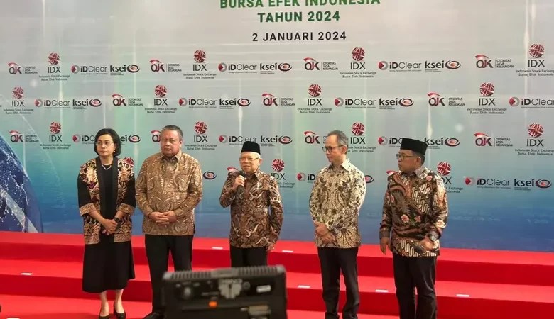 BISNISBANTEN.COM — Menteri Keuangan (Menkeu) Sri Mulyani Indrawati menghadiri pembukaan perdagangan Bursa Efek Indonesia (BEI) tahun 2024 pada hari ini, Selasa (02/01) yang diresmikan oleh Wakil Presiden Republik Indonesia (Wapres RI), Ma’ruf Amin.