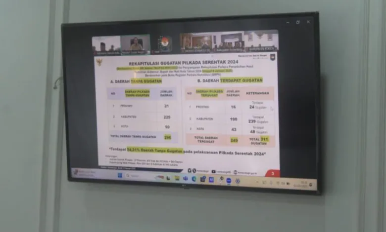 Hal itu berdasarkan rekapitulasi gugatan pilkada serentak tahun 2024, berdasarkan surat Mahkamah Konstitusi (MK) nomor 76/AP.03.05/01/2025 hal penyampaiannya rekapitulasi perkara perselisihan hasil Pemilihan Gubenur, Bupati dan Wali Kota tahun 2024 tanggal 6 Januari 2025 berdasarkan pada Buku Register Perkara Konstitusi (BRPK).