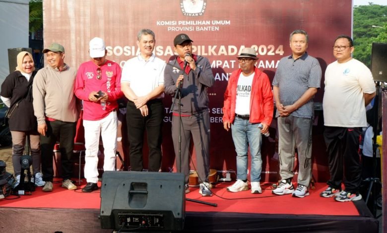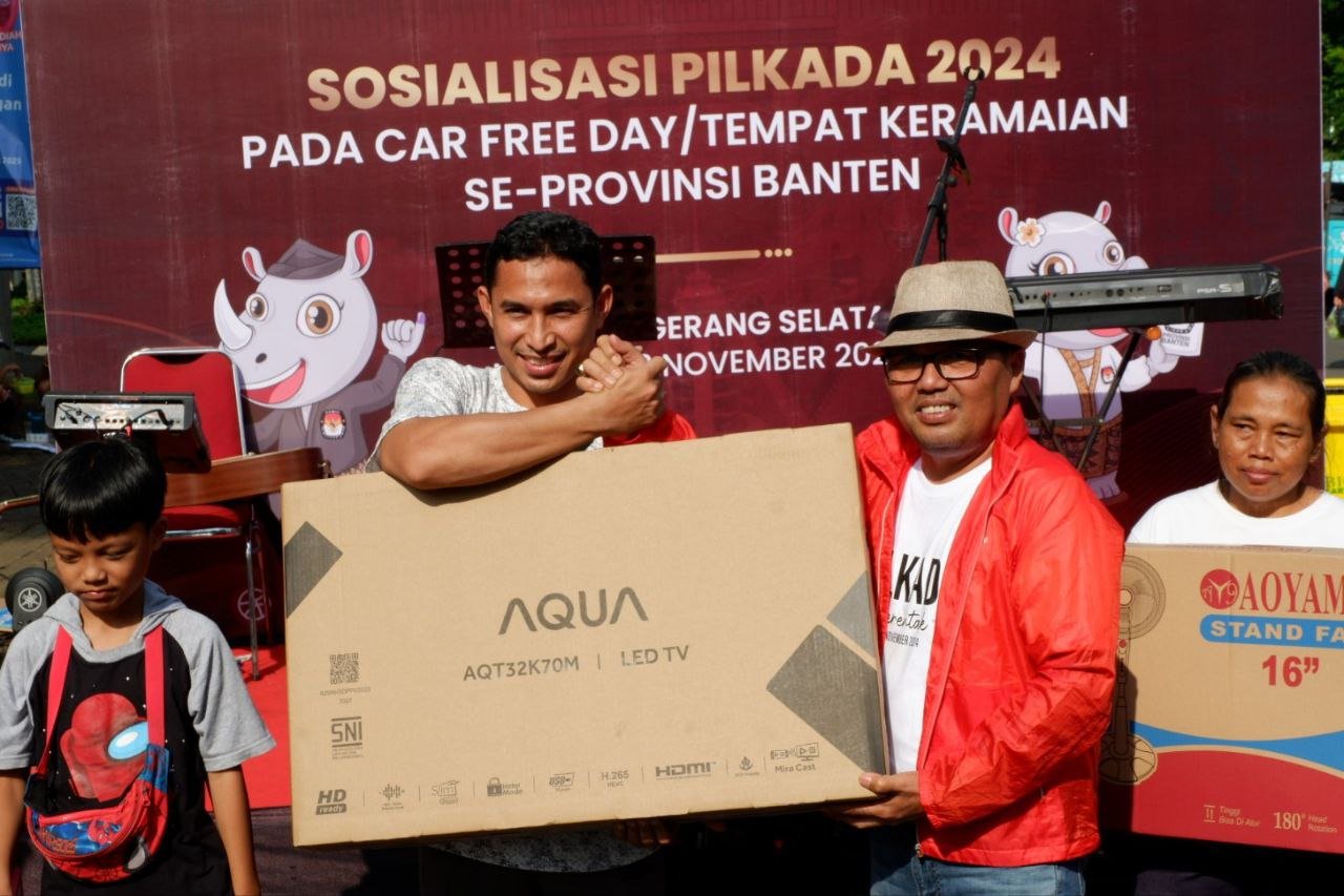 Sosialisasi digelar dengan berbagai acara menarik seperti senam sehat, kuis interaktif, live musik yang dihadiri oleh Ketua KPU Banten Mohamad Ihsan, anggota KPU Aas Satibi, M Agus Muslim, Sekretaris KPU Ferry Syahminan.