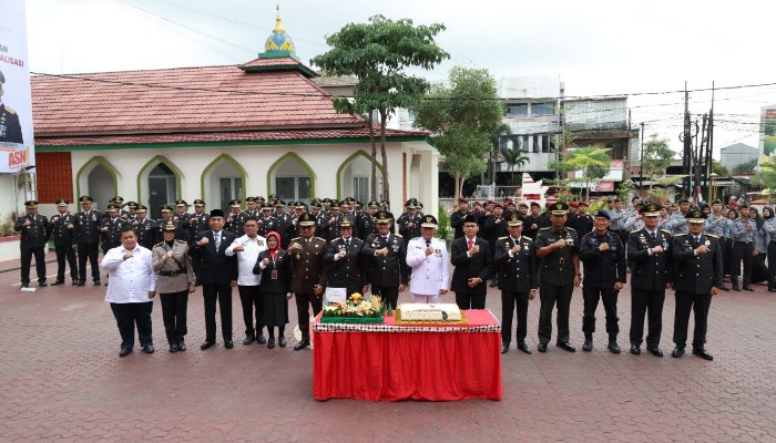 Seusai mengikuti upacara, Al Muktabar dampingi Kepala Kanwil Kemenkumham Banten Dodot Adikoeswanto memotong tumpeng sebagai bentuk rasa syukur. (susi)