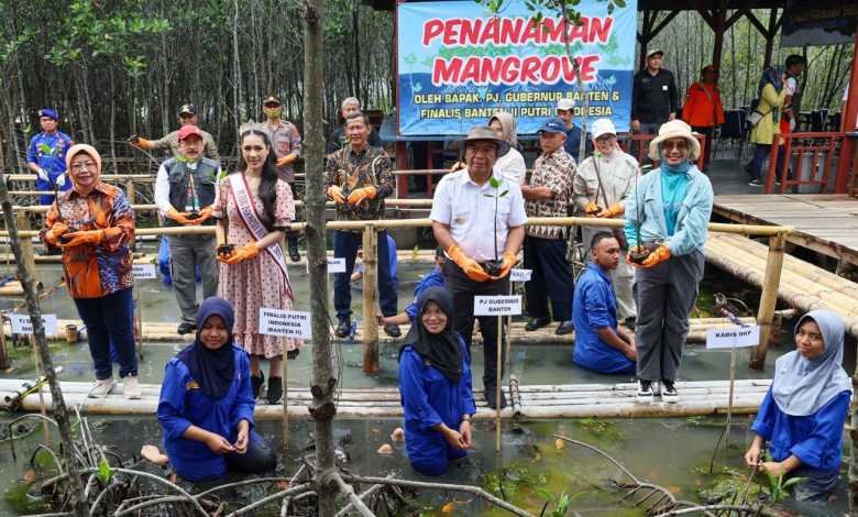 BISNISBANTEN.COM — Penjabat Gubernur Banten Al Muktabar menanam pohon mangrove di Smart Fisheries Village Politeknik Ahli Usaha Perikanan Karangantu, Kota Serang, Minggu (18/2/2024). Bentuk pemeliharaan terhadap ekosistem di kawasan Teluk Banten melibatkan Pj Sekretaris Daerah Provinsi Banten Virgojanti, Finalis Putri Indonesia 2024 Banten 2 Latisa Maura dan para Kepala Organisasi Perangkat Daerah (OPD) Pemprov Banten.