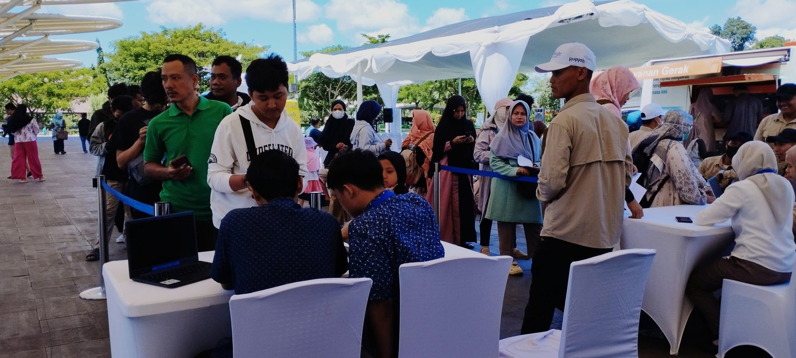 Terlihat terjadi antrean panjang di setiap unit mobil kas keliling yang sedari pagi sudah berjejer di dalam Alun-alun Kota Cilegon siap memberikan pelayanan.