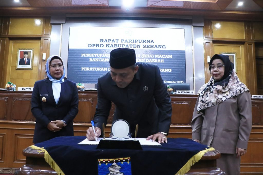 *BISNISBANTEN.COM*- Pemerintah Kabupaten (Pemkab) Serang mengesahkan Peraturan Daerah (Perda) tentang Sistem Pelayanan Berbasis Elektronik (SPBE) pada Rapat Paripurna DPRD Kabupaten Serang, Kamis (21/12/2023). Perda untuk memperkuat pelayanan berbasis elektronik kepada masyarakat.