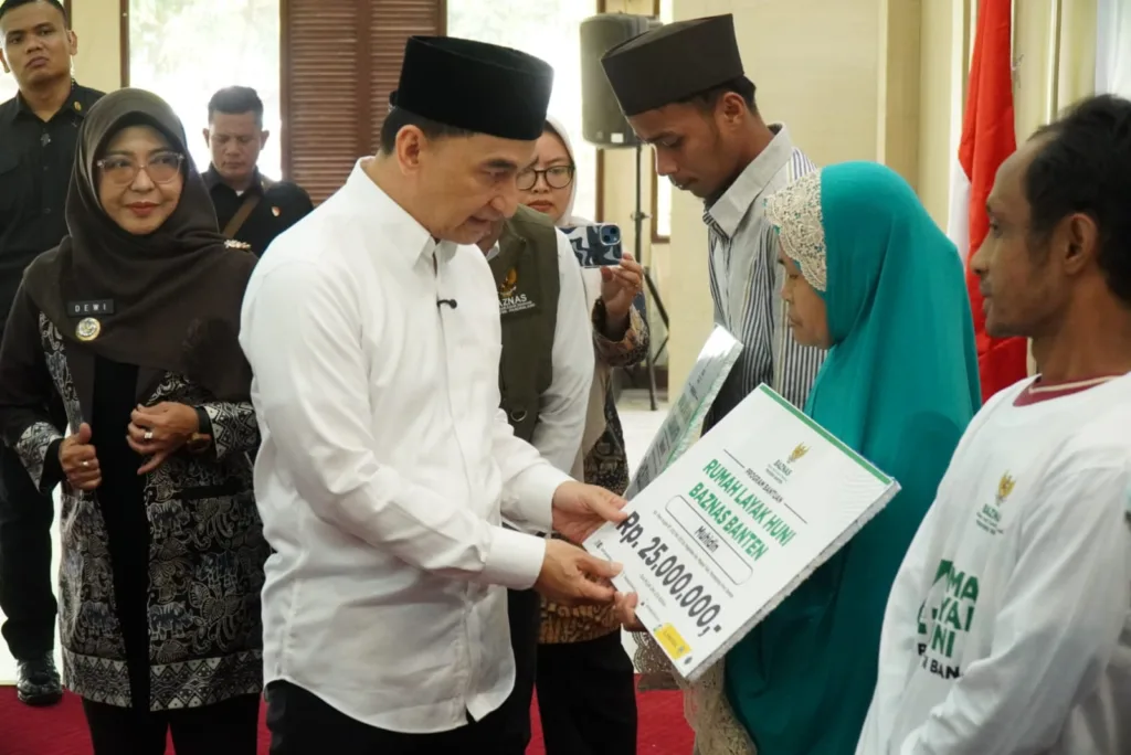 BISNISBANTEN.COM – Wakil Gubernur (Wagub) Banten Dimyati Natakusumah didampingi Bupati Pandeglang Raden Dewi Setiani menyalurkan bantuan program Rumah Layak Huni Baznas (RLHB) dan Pendidikan dari Badan Amil Zakat Nasional (Baznas) Banten dan Pandeglang di Pendopo Bupati Pandeglang, Kamis (3/7/2025). Dimyati menilai, bantuan menjadi pendorong semangat warga Pandeglang untuk terus bangkit dan membangun masa depan lebih baik.