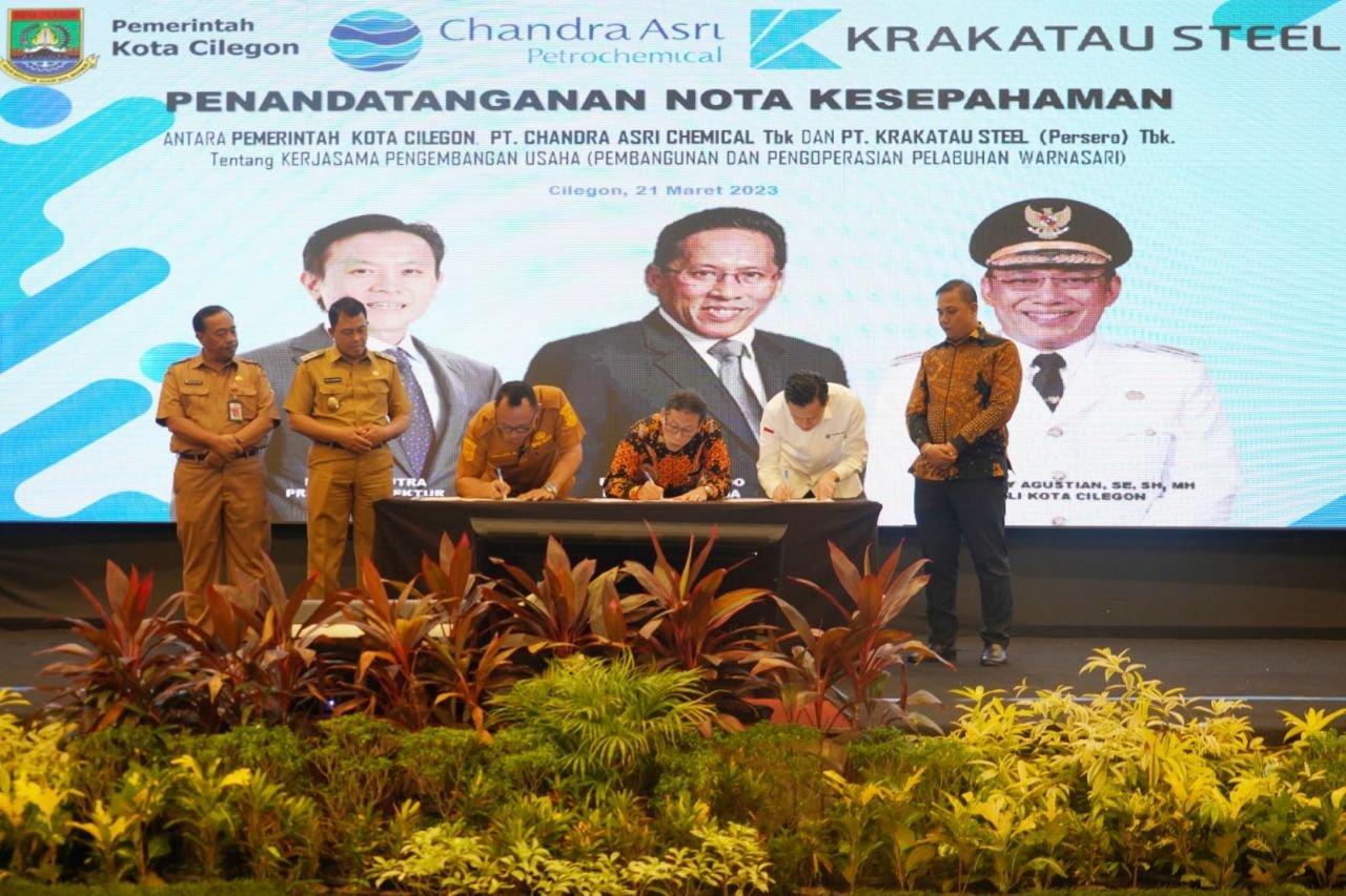 BISNISBANTEN.COM — Wali Kota Cilegon Helldy Agustian tampaknya tidak main-main untuk segera merealisasikan pembangunan Pelabuhan Warnasari yang dinantikan masyarakat sejak lama. Setelah menempuh perjalanan panjang, akhirnya digelar penandatanganan Memorandum of Understanding (MoU) yang dilakukan langsung oleh orang nomor satu di 2 perusahaan raksasa Nasional, yakni PT Krakatau Steel (KS) Tbk dan PT Chandra Asri Petrochemical (CAP) Tbk dengan Pemerintah Kota (Pemkot) Cilegon tentang Pembangunan Pelabuhan Warnasari di The Royale Krakatau Hotel Cilegon, Selasa (21/3). Penandatanganan nota kesepahaman itu merupakan tindaklanjut dari rentetan perjalanan sebelumnya, yakni penandatanganan nota kesepahaman antara PT KS Tbk dengan Pemkot Cilegon di Aula Sekretariat Daerah (Setda) II Kota Cilegon pada Maret 2022, lalu dilanjutkan dengan penandatanganan berita acara kerjasama sinergi antara PT KS Tbk dengan Pemkot Cilegon di BSD Kota Tangerang pada September 2022 dan Pertemuan Tri Partit antara Wali Kota Cilegon Helldy Agustian dengan Direktur Utama (Dirut) PT KS Tbk Purwono Widodo dan Presiden Direktur (Presdir) PT CAP Tbk Erwin Saputra di Hotel Fairmont Jakarta pada awal Maret 2023.