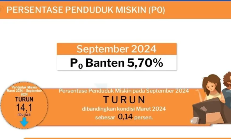 BISNISBANTEN.COM Berdasarkan Berita Resmi Statistik Badan Pusat Statistik Provinsi Banten Nomor 05/01/36/Teh.XIX, 15 Januari 2025, persentase penduduk miskin Provinsi Banten turun. Dibanding periode Maret 2024 yang 5,84 persen, turun 0,14 persen menjadi 5,7%pada periode September 2024.