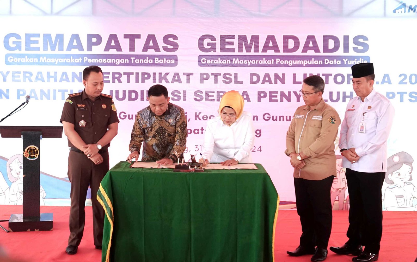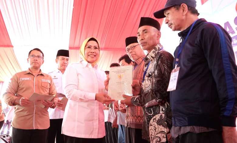 BISNISBANTEN.COM – Kepala Kantor Wilayah Badan Pertanahan Nasional (BPN) Provinsi Banten Sudaryanto didampingi Bupati Serang Ratu Tatu Chasanah dan Pelaksana Tugas (Plt) Kepala Kantor Pertanahan Kabupaten Serang Yayat Ahadiyat Awaludin membagikan 70 sertifikat gratis program Pendaftaran Tanah Sistematis Lengkap (PTSL) dan Lintas Sektor (Lintor) Tahun Anggaran (TA) 2023 kepada warga Kabupaten Serang di sejumlah Kecamatan pada acara Gerakan Bersama Pemasangan Tanda Batas (Gemapatas) Gerakan Bersama Penyiapan Data Yuridis (GEMADADIS) Penyerahan Sertifikat PTSL dan Lintor TA 2023 dirangkaikan Pelantikan Panitia Ajudikasi serta Penyuluhan PTSL TA 2024 di Lapangan Desa Gunungsari, Kecamatan Gunungsari, Kabupaten Serang, Banten, Rabu (31/01/2024). Acara dihadiri sejumlah Camat dan Kepala Desa (Kades) di Kabupaten Serang.
