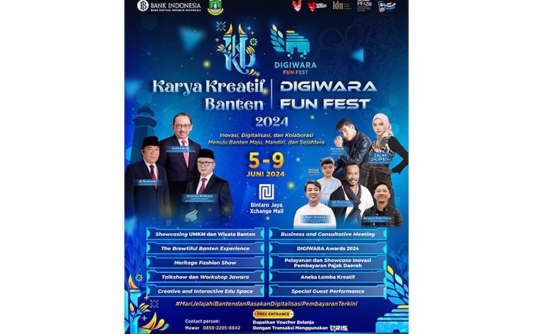 BISNISBANTEN.COM – Bank Indonesia Provinsi Banten dan Pemerintah Provinsi Banten berupaya untuk terus mendukung Inovasi, Digitalisasi, dan Kolaborasi Menuju Banten Maju, Mandiri dan Sejahtera melalui kegiatan Karya Kreatif Banten & Digiwara Fun Fest 2024.