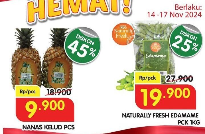 Ada juga promo segarnya hemat, dimana banyak diskom untuk beberpa buah, seperti Sunpride Pisang Cavendish, Pear Sweet, Nanas Kelud, Naturally Fresh Edamame. Ada diskon dari 25 persen sampai 45 persen. Berlaku dari 14 sampai 17 November.