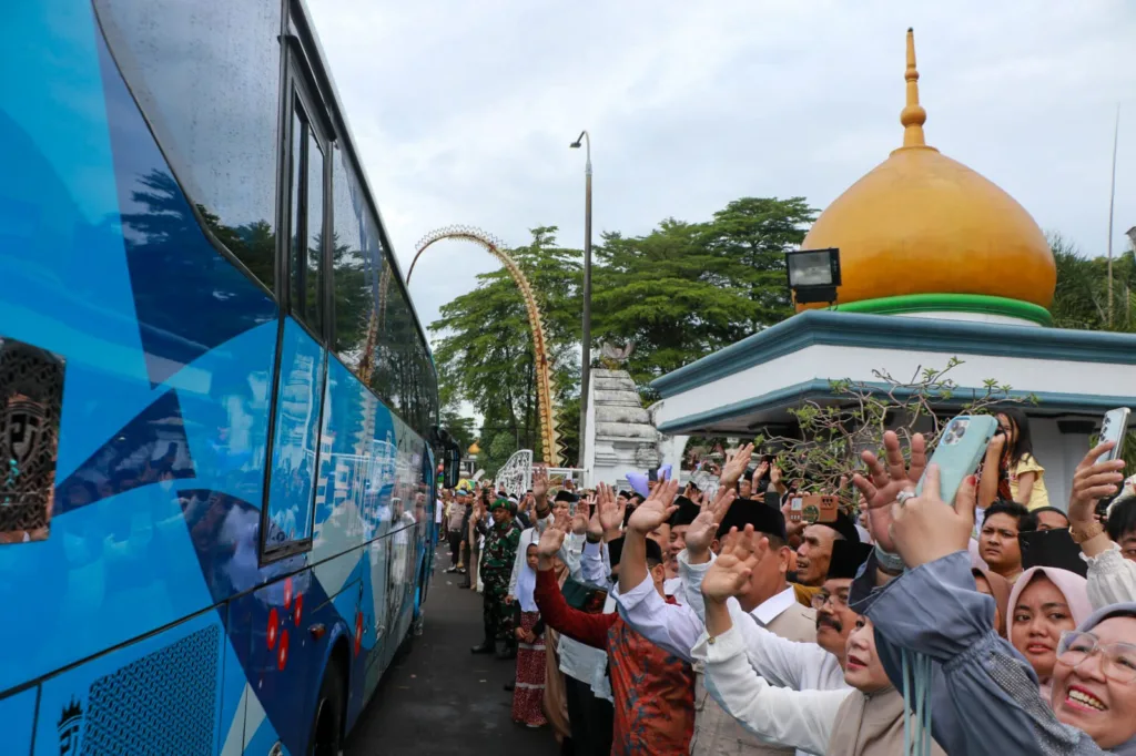 Tampak ratusan Calhaj maupun keluarganya berpelukan erat sambil berurai air mata saat proses pelepasan pemberangkatan Calhaj menggunakan bis yang sudah disiapkan panitia usai acara seremonial.