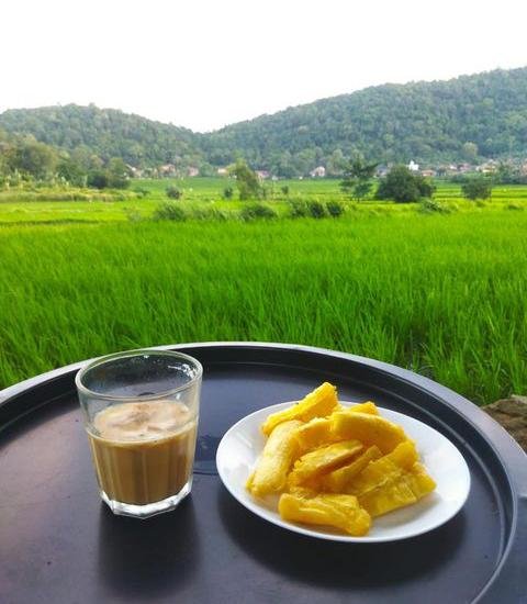 Coffeeshop ini mengusung konsep outdoor menyuguhkan suasana pedesaan dengan view gunung dan bukit diiringi angin sepoi-sepoi serta hamparan sawah menghijau, membuat suana jadi makin asri, sejuk dan nyaman saat kongkow di sini. Vibesnya juga berasa lagi di Ubud Bali loh.