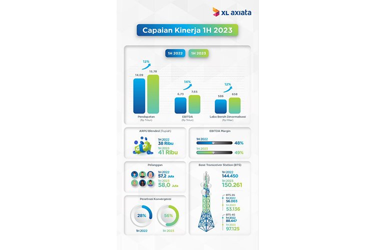 BISNISBANTEN.COM — PT XL Axiata Tbk (XL Axiata) berhasil meraih pertumbuhan yang semakin kuat di sepanjang semester pertama tahun 2023. Kinerja keuangan perseroan tumbuh double digit di tengah kompetisi dan dinamika industri. Selama periode ini, XL Axiata terus memperkuat eksekusi strategi konvergensi dengan mendorong bisnis fixed mobile convergence (FMC) di semua area, termasuk pada produk, infrastruktur jaringan dan IT, hingga manajemen. XL Axiata berhasil meraih total pendapatan sebesar Rp 15,78 triliun, tumbuh sebesar 12% lebih tinggi dari periode yang sama tahun lalu (YoY). Pendapatan data dan layanan digital mencapai Rp 14,41 trilun, atau sekitar 91% dari total pendapatan.