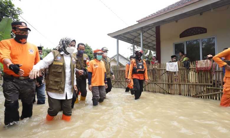 BISNISBANTEN.COM — Bupati Serang Ratu Tatu Chasanah meninjau lokasi banjir dan menurunkan bantuan bagi warga di Kampung Kajeroan, Desa Rancasanggal, Kecamatan Cinangka, Kamis (3/3/2022). Untuk mencegah banjir terulang, Tatu meminta revitalisasi Rawa Danau dipercepat.