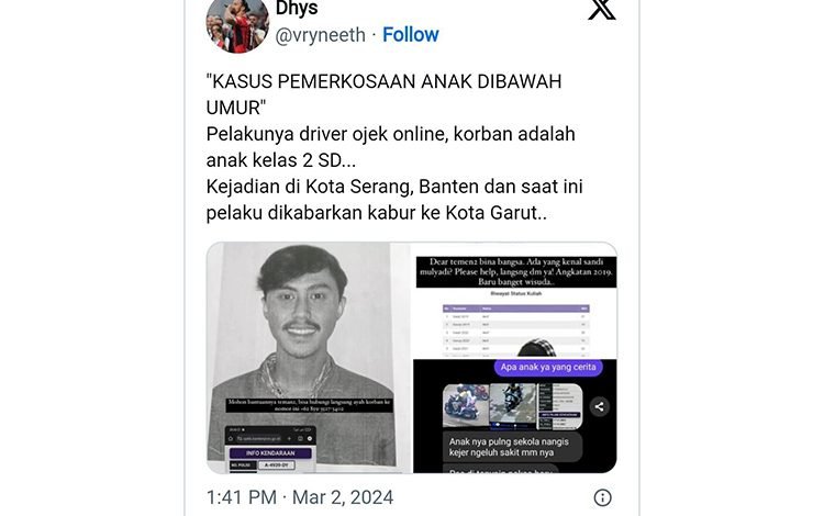 Kasus dugaan pemerkosaan ini pertama kali diviralkan oleh akun X (Twitter) @vryneeth pada Sabtu, 2 Maret 2024. Diketahui dari postingan pengguna akun X tersebut, pelaku bernama Sandi Mulyadi merupakan seorang mahasiswa angkatan 2019 di salah satu kampus di Kota Serang, yakni Universitas Bina Bangsa, yang juga berprofesi sebagai ojol di aplikasi Maxim.