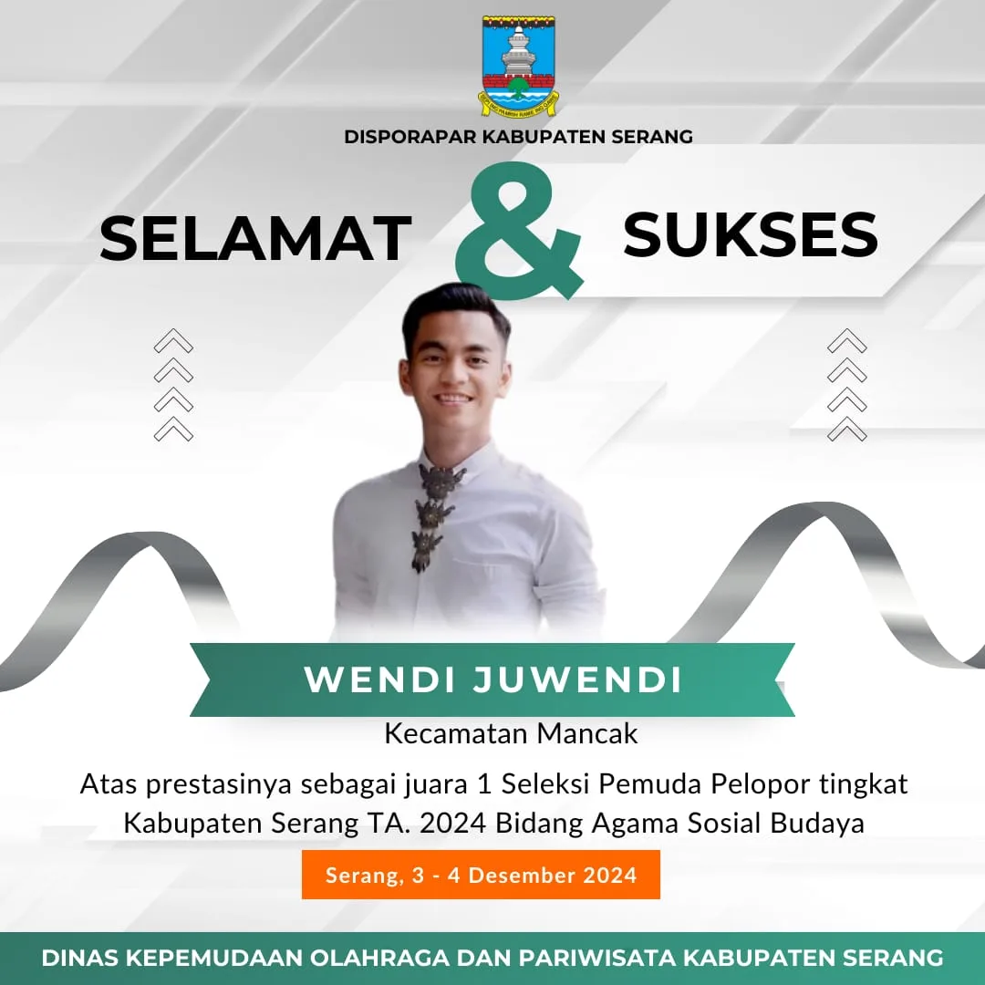 “Puji sukur saya ucapkan terima kasih yang sebesar-besarnya kepada orangtua saya, keluarga, serta rekan-rekan yang mensupport saya pada ajang Seleksi Pemuda Pelopor tingkat Kabupaten Serang 2024 yang diselenggarakan Disporapar Kabupaten Serang pada 3-4 Desember 2024, sehingga meraih juara 1 Bidang Agama Sosial dan Budaya,” ucap Wendi kepada bisnisbanten.com melalui pesan WhatsApp, kemarin.